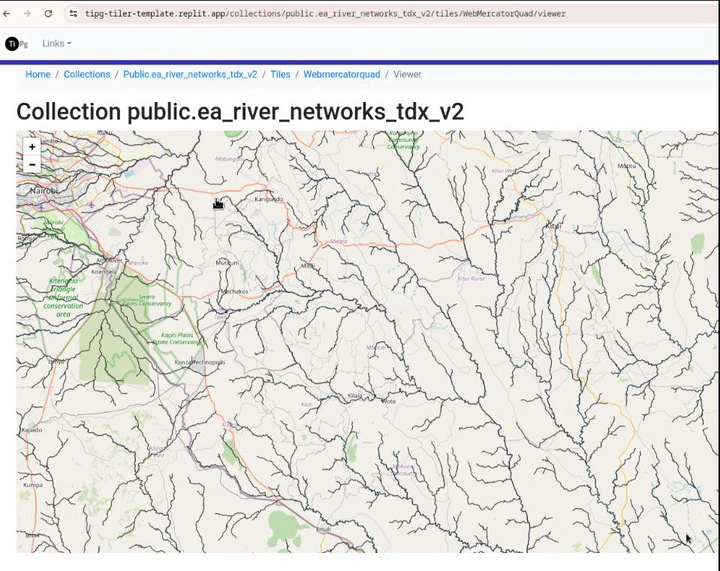 TiPG (Tiles from PostGIS) serves vector tiles in Mapbox Vector Tile (MVT) format directly from PostGIS databases. It enables efficient streaming of vector data like administrative boundaries, river networks, and point features without pre-generating tile pyramids.